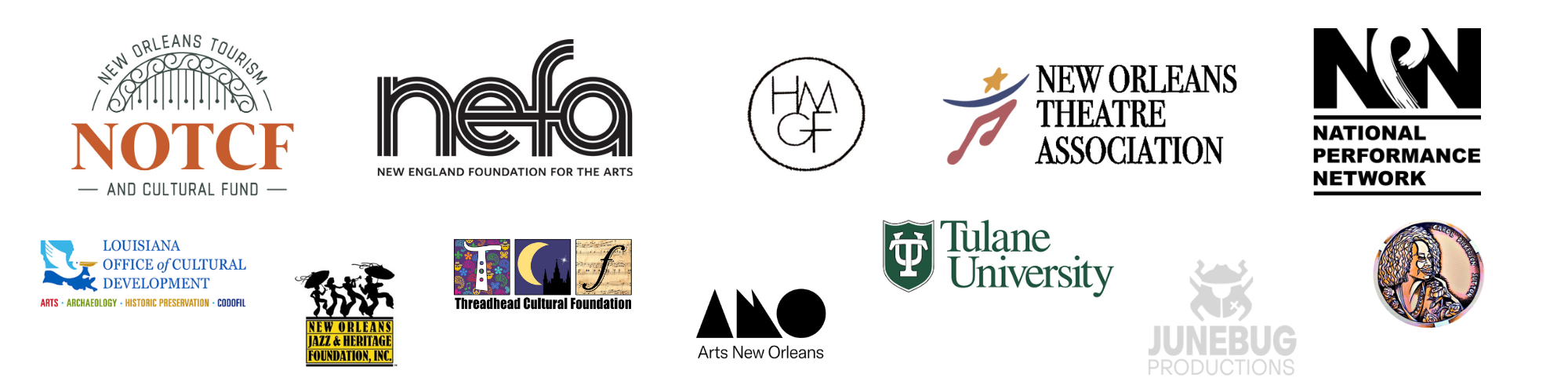 Carlota is made possible by support from the New England Foundation of the Arts’ (NEFA) National Theater Project, and Creation Fund support from the National Performance Network (NPN). Lead commissioner, NPN: Junebug Productions. Co-commissioner: Duke Arts. It is also supported by the New Orleans Tourism & Cultural Foundation and the New Orleans Theatre Association, as well as the Harper Family Foundation and the Mitchiner-Gittinger Family Foundation. Additional support comes from a Carol Sutton Memorial Grant, a Jazz & Heritage Foundation Community Partnership grant, and a Louisiana Project Grant administered by the Louisiana Division of the Arts and Arts New Orleans. Carlota is also supported by Tulane University’s Stone Center and the Threadhead Cultural Foundation.